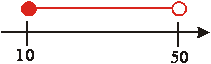 El extremo izquierdo del segmento está relleno, entonces es cerrado y el 10 se incluye en el intervalo. El extremo derecho del segmento no está relleno, por lo tanto el intervalo es abierto y el 50 no se incluye en el intervalo.